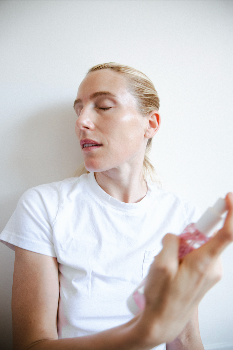 2. Hold the bottle 8-10 inches from your face and spray evenly.